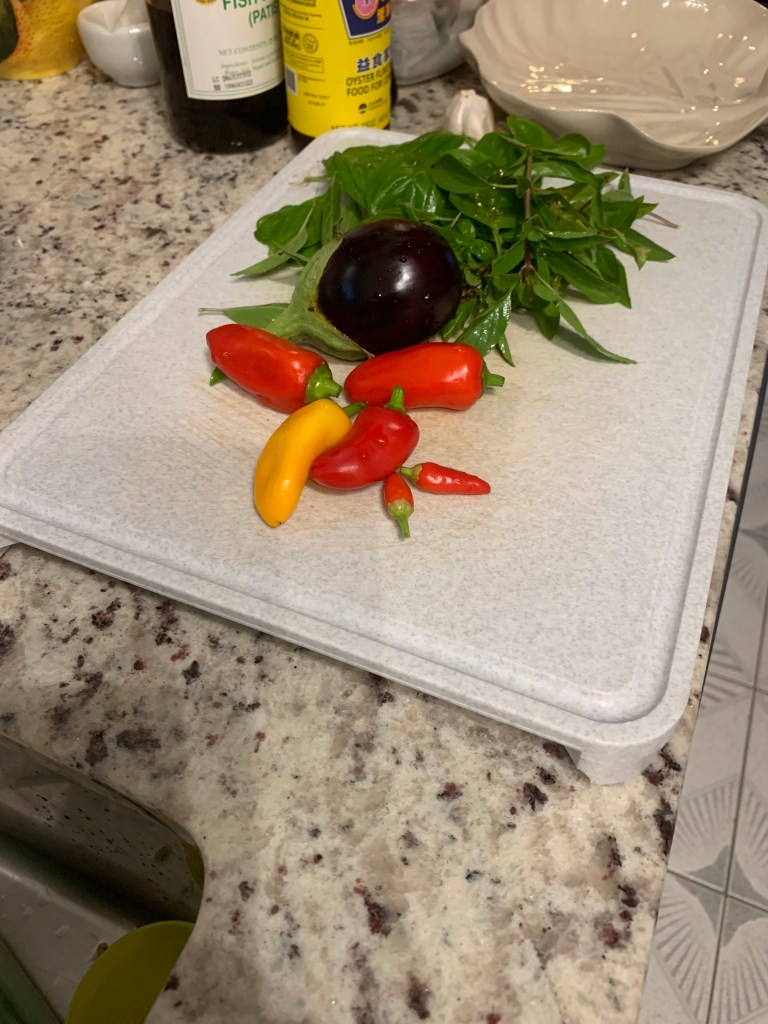 Since I started gardening last year, I get very excited when my fruits & veggies are ready to harvest; it always makes me want to plant more. The greatest thing about growing a garden is the feeling of accomplishment to know I grew my own food. There is nothing better than being able to make dinner from your very own garden. On this evening, my modest bounty consisted of one small eggplant, three mini sweet red bell peppers, one mini sweet yellow bell pepper, two hot peppers, Sweet basil, and Thai Basil. That’s it. That is all it took to inspire a meal. I am feeling like Thai food tonight. And what Thai dish loves basil, well a lot, but my choice for dinner is Drunken Noodle, drunken noodle extra (with the bell peppers & eggplant). This dish will require dried rice noodles and a few Asian condiments that are usually in my pantry.
