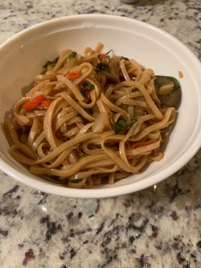 A quick fry of the garlic, onions, and hot peppers (don’t let the small size deceived you, they are very hot), add the other vegetables and the soaked noodles and give it a toss or two. I add in the pre-made sauce and save the basil for last. Delicious! The internet and Pinterest have endless recipe ideas for whatever suits your tastebuds; I am grateful to have options to continue through my vegetarian journey. People often ask if I miss eating meat, and I can honestly answer no. My world has opened up to options I never know existed. I take the time to find alternatives now because I have chosen to no longer indulge in meat. I use a lot of regular recipes and substitute the meat with vegetables. After a meal, I feel satisfied and not sluggish. As long as my garden stays fruitful, I will continue to grow ingredients for my breakfast, lunch and, dinners. Find the full recipe: https://www.recipetineats.com/pad-kee-mao-thai-drunken-noodles.